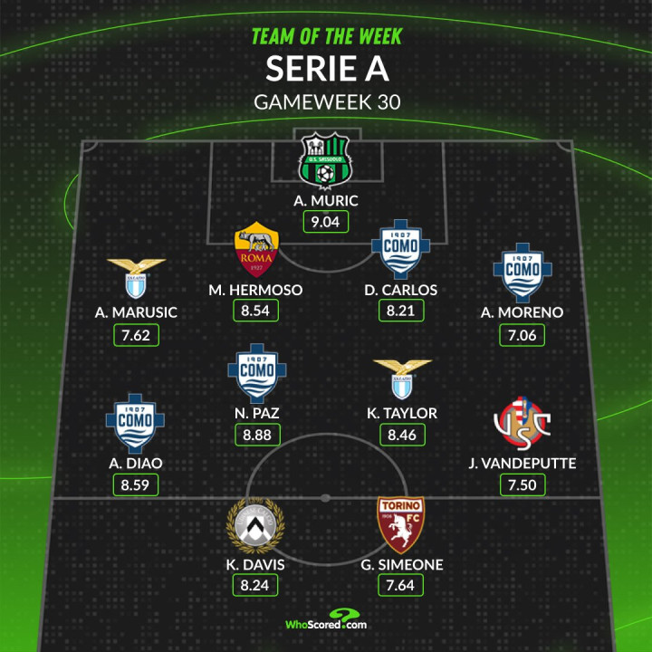 虎扑03月24日讯著名统计网站WhoScored日前公布了本轮意甲最佳阵容,科莫4人入选,拉齐奥2人在列。